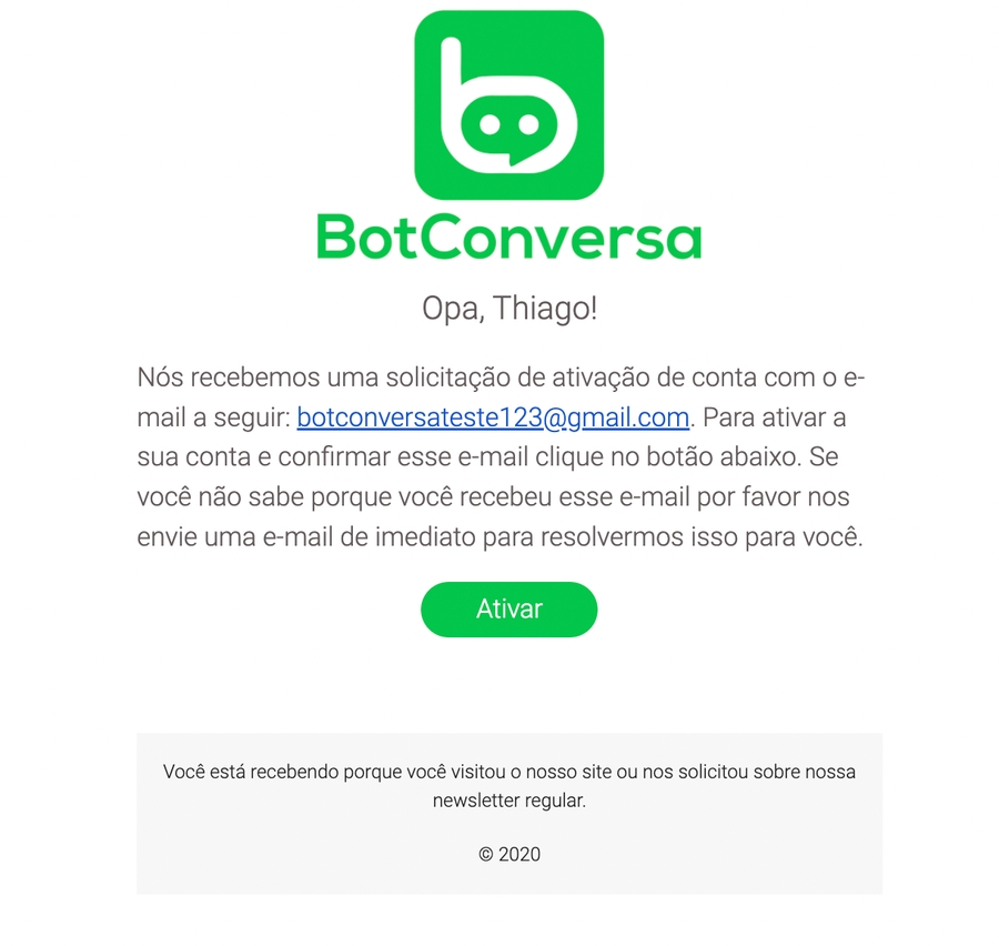 A única coisa que você precisa fazer é clicar no botão verde para ativar a sua conta. Após isso você poderá fazer login no BotConversa com o login e senha que você utilizou no cadastro.