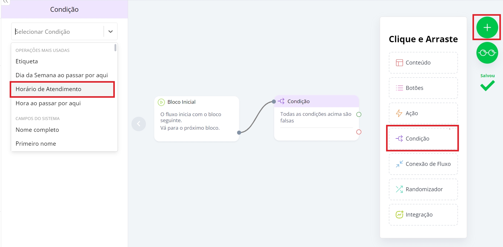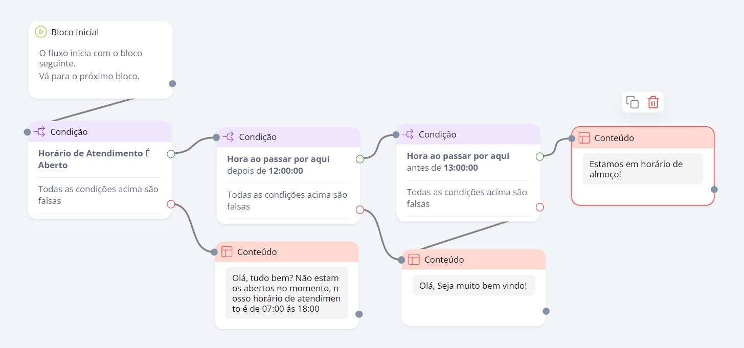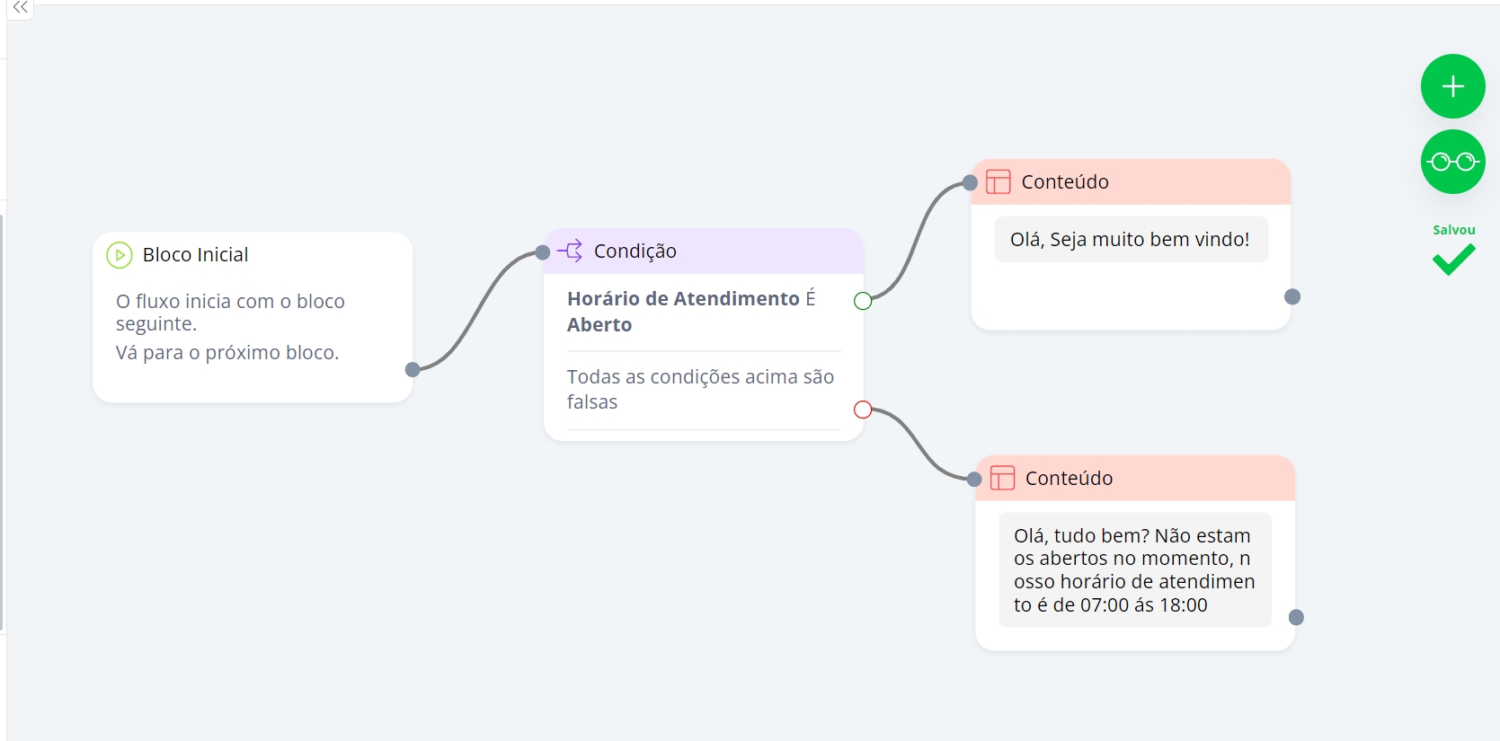 No inicio do seu fluxo crie uma condição de horário de atendimento e selecione a opção É Aberto. A partir daí, tudo que você quiser que seja enviado quando seu negócio estiver aberto basta colocar no conector verde e o no conector vermelho o que deseja enviar quando seu negócio estiver fechado.