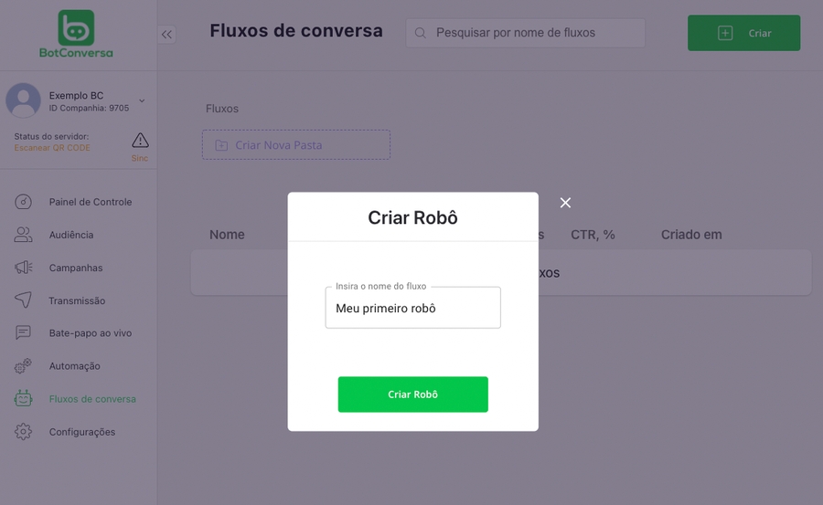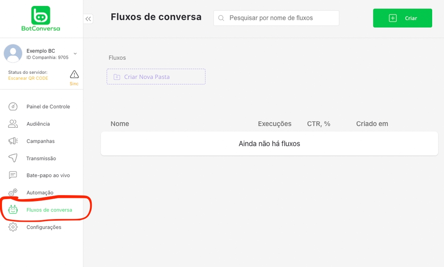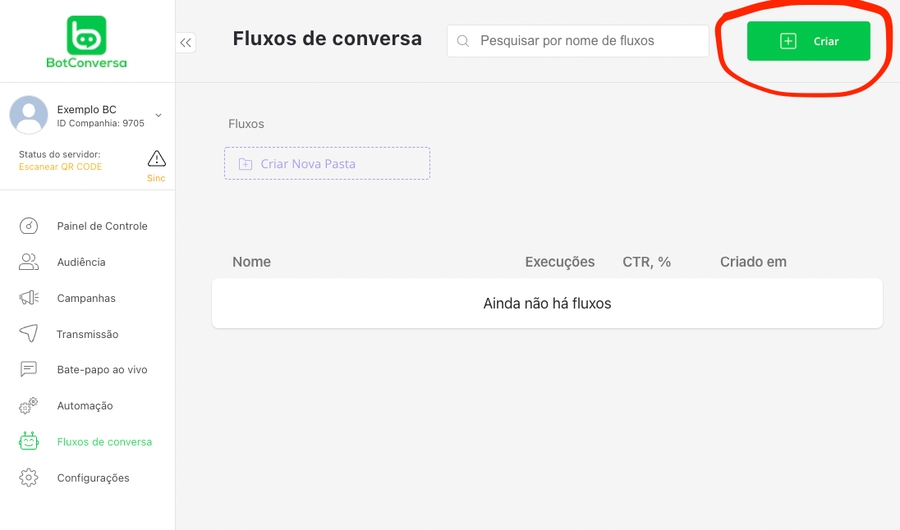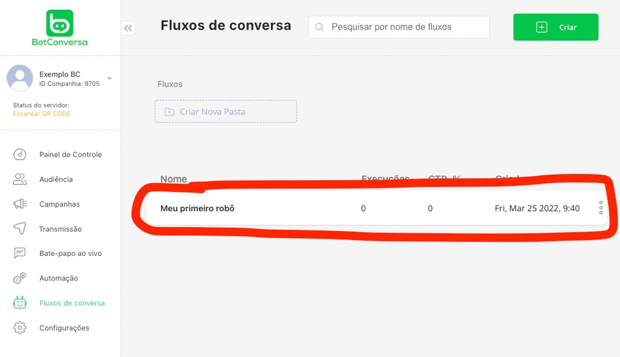Clique no botão "Criar" para criar o seu primeiro fluxo de conversa.