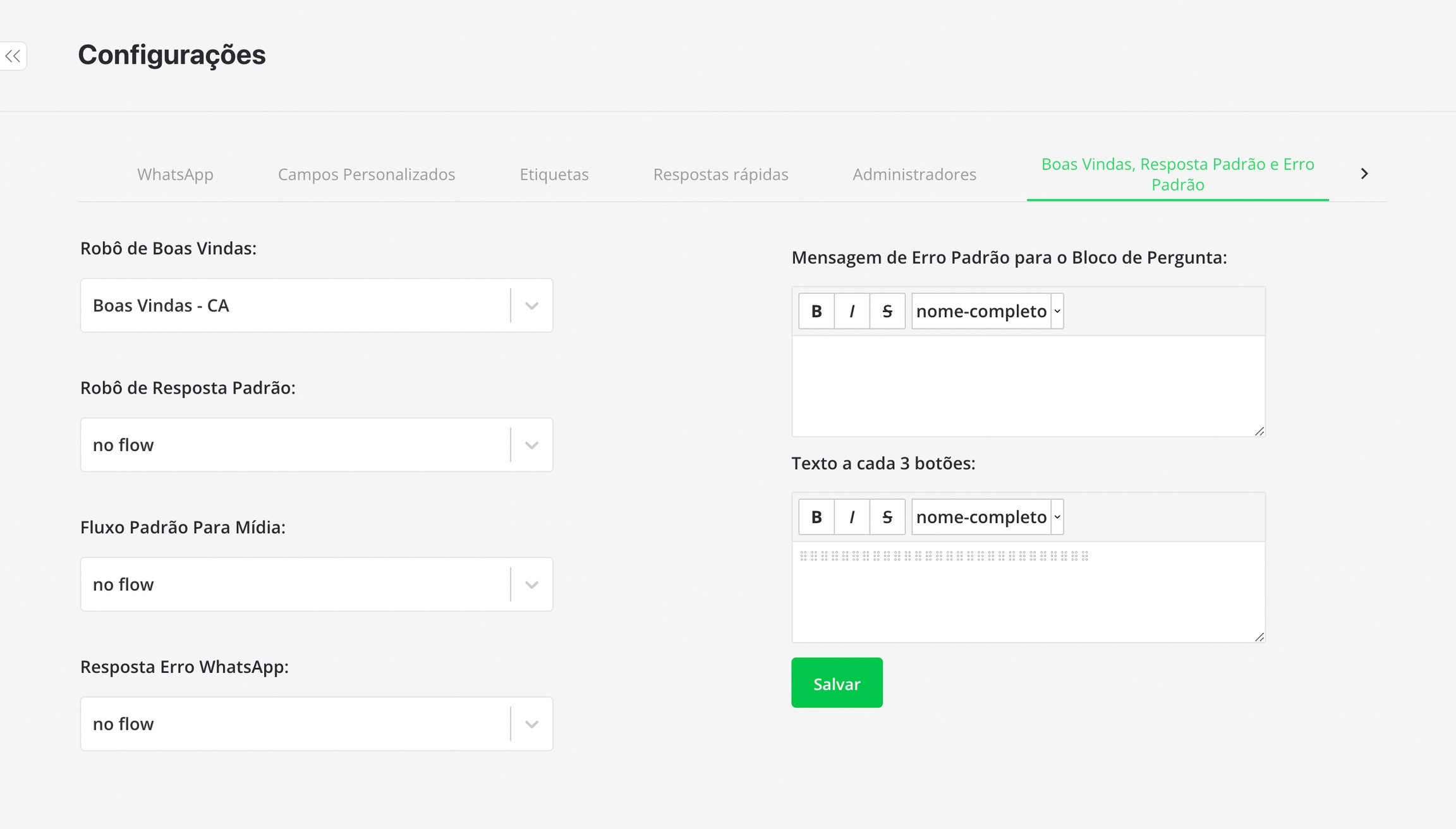 Clique no seletor dropdown do Robô de Boas Vindas e escolha o fluxo que você deseja acionar toda vez que uma nova pessoa te enviar uma mensagem qualquer que não possua uma palavra chave.