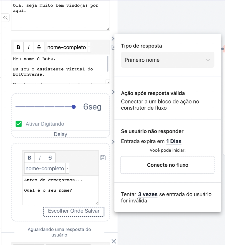 Depois utilizamos o elemento de delay com tempo de 6 segundos para dar tempo da pessoa ler a mensagem dos textos acima antes do robô continuar com a próxima mensagem.