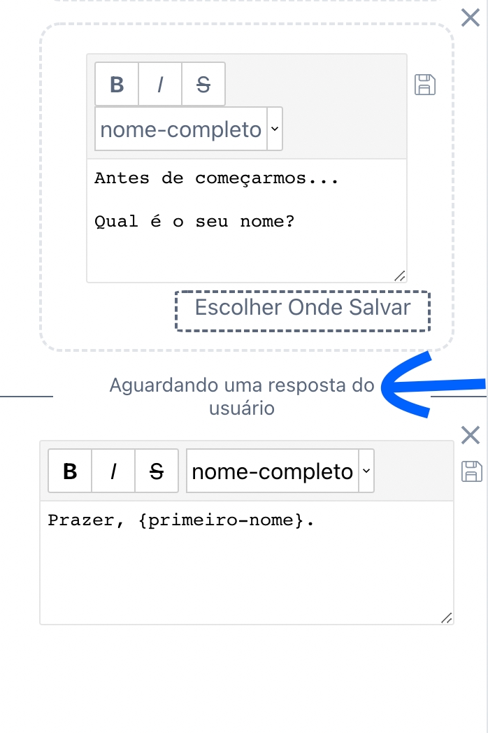 Após o delay utilizamos o elemento Salvar para fazermos uma pergunta e salvarmos a resposta do usuário.