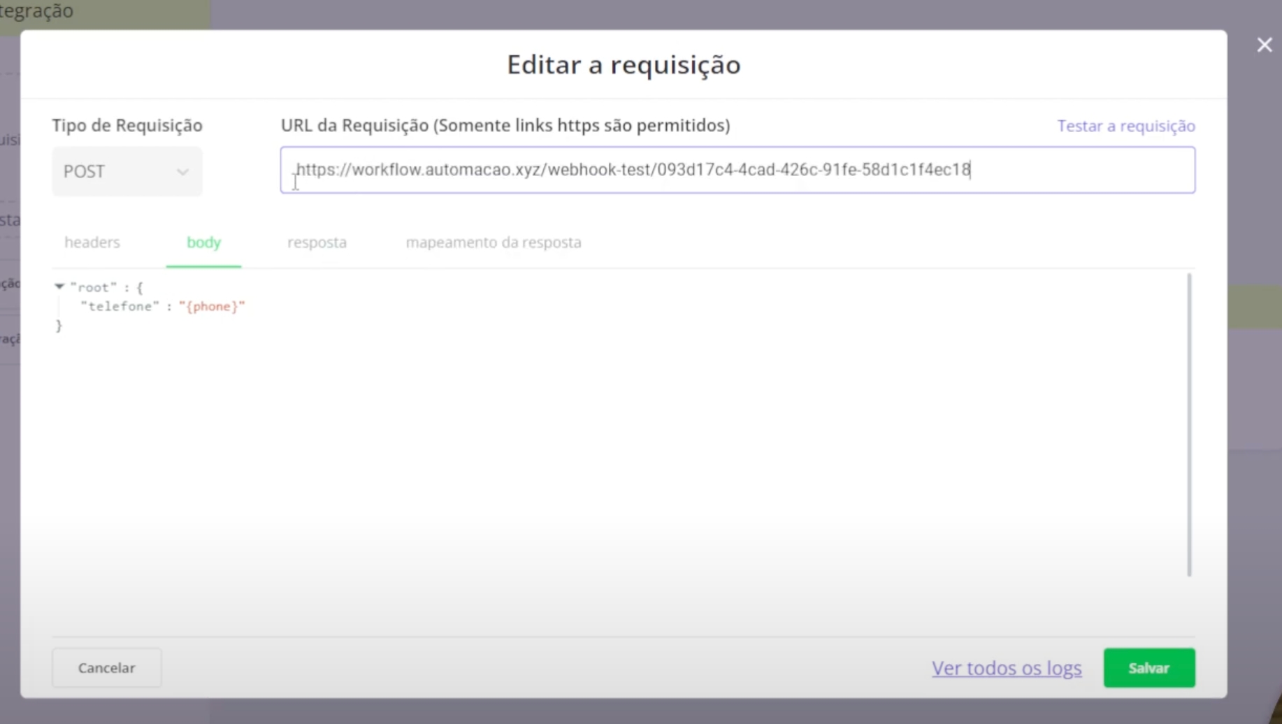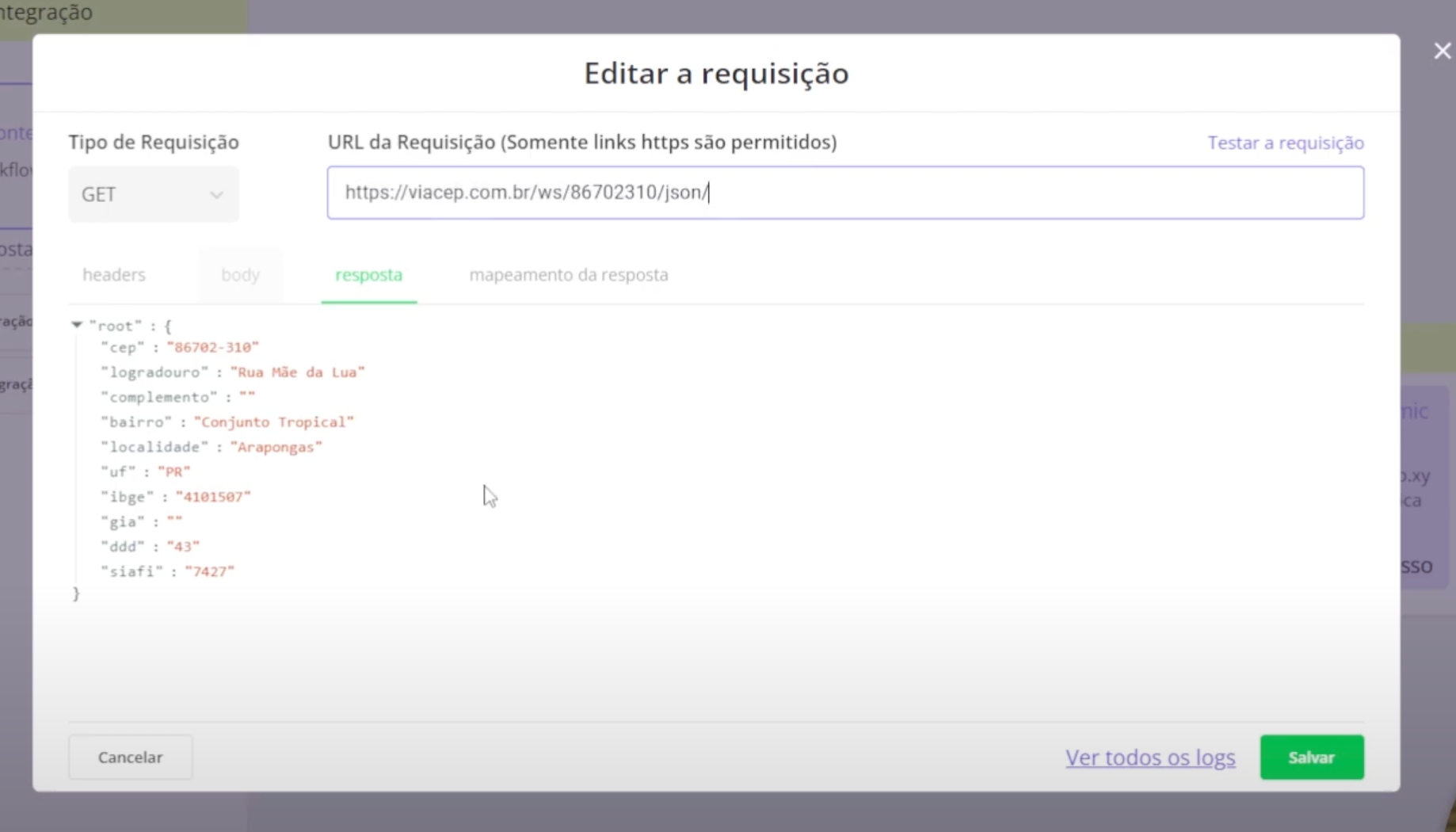 O campo de resposta é basicamente o retorno da sua requisição API, por ele você receberá uma mensagem de sucesso quanto também receberá seus dados de uma requisição GET, podendo mapear posteriormente na aba de Mapeamento de Resposta, como verá abaixo.