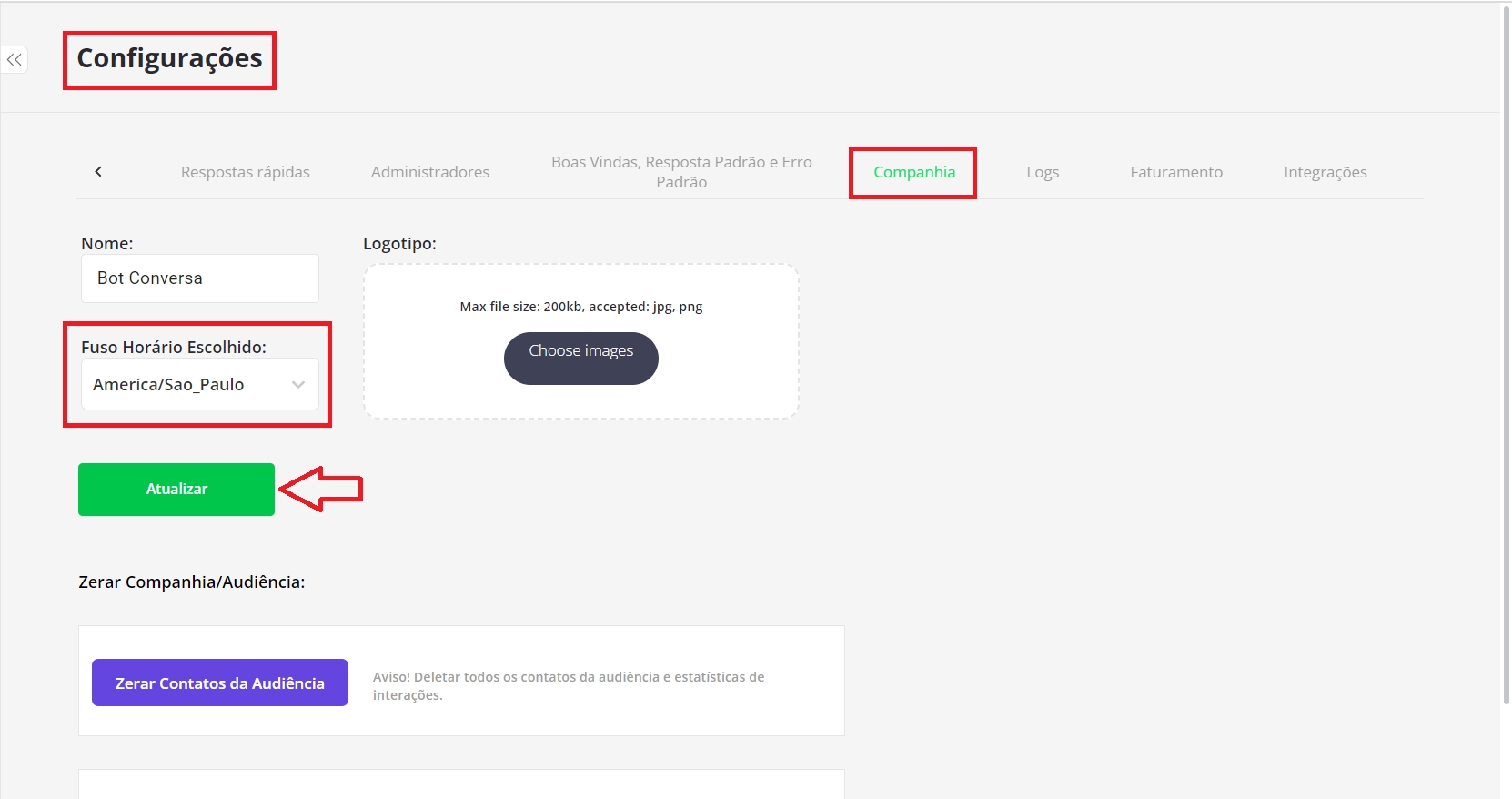Corrija o fuso em Configurações > Companhia > Fuso da sua localidade (Fuso sugerido: America/Sao_Paulo). Não esqueça de salvar as configurações ao final clicando em Atualizar.