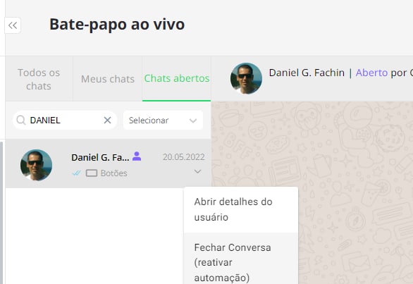 2. Clica sobre a setinha sobre o teu contato e clica sobre FECHAR CONVERSA para reativar a automação.